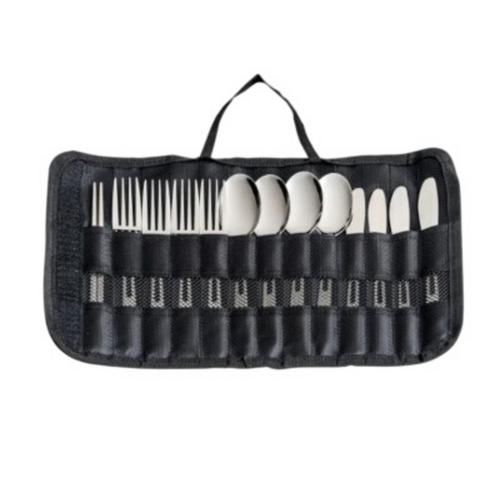 The Camp Cutlery Set is a versatile, 13-piece stainless steel dining solution, perfect for outdoor adventures and daily use. Dishwasher-safe, durable, and compact, it includes service for four and a travel case that doubles as a display stand.