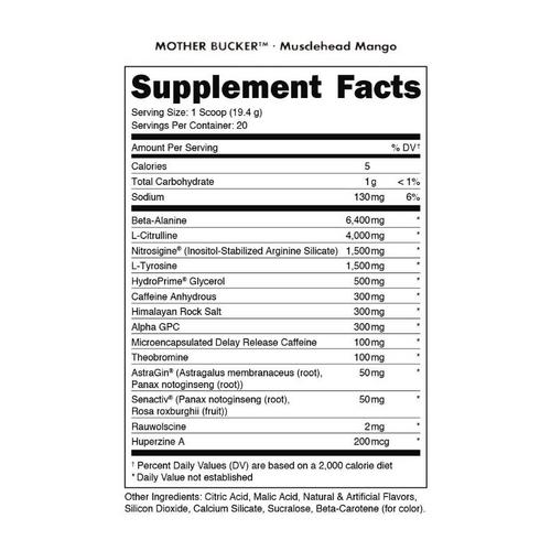 Mother Bucker is not for the casual gym-goer or those new to pre-workouts. This new pre-workout is only for those who possess an intense drive. It's a powerful formula! The truth is, this pre-workout is designed for experienced users. If you?re ready for serious power, then become a MOTHERBUCKER and turn it up to 11.