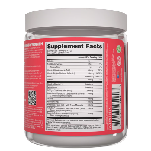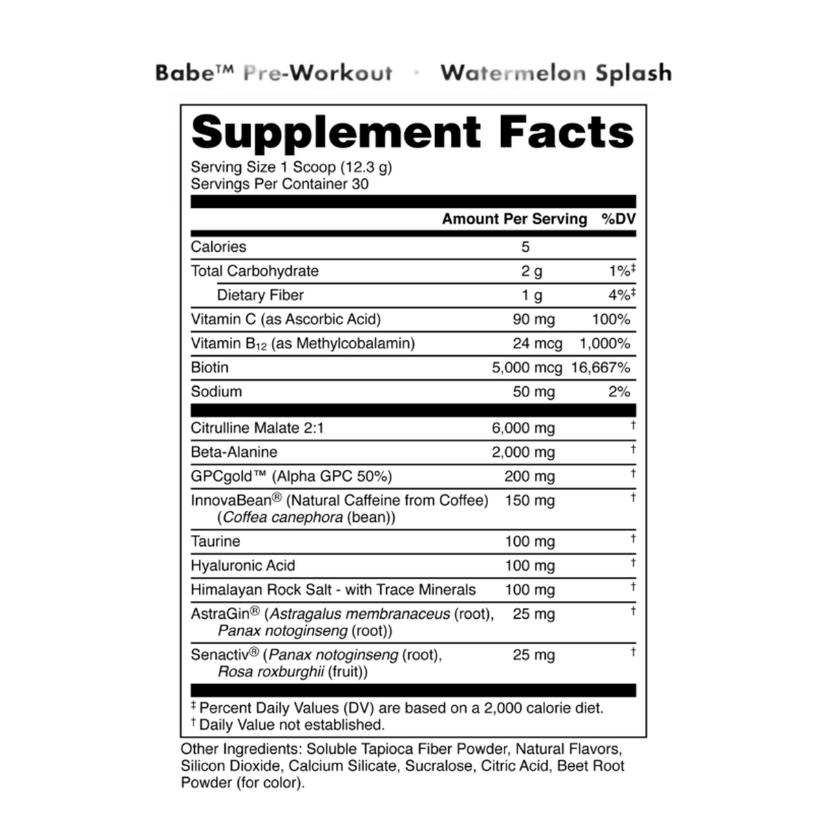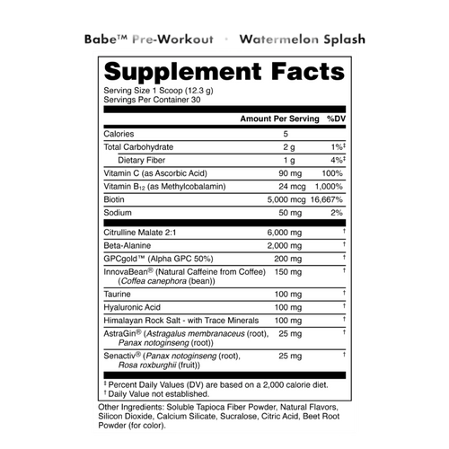 Babe Pre-Workout doesn’t stop there. Groundbreaking nootropics help increase your mental and physical stamina, empowering you to push yourself harder.* Beta-alanine helps to reduce muscle soreness and increase muscular endurance*, and biotin and Vitamin B12 form an incomparable duo to promote overall health.*