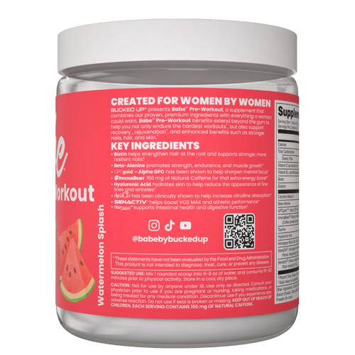 Bucked Up presents Babe Pre-workout, a supplement that combines our proven, premium ingredients with everything a woman could want. Babe is designed by women, for women, ensuring that you get the best workout experience from the best pre-workout for women.