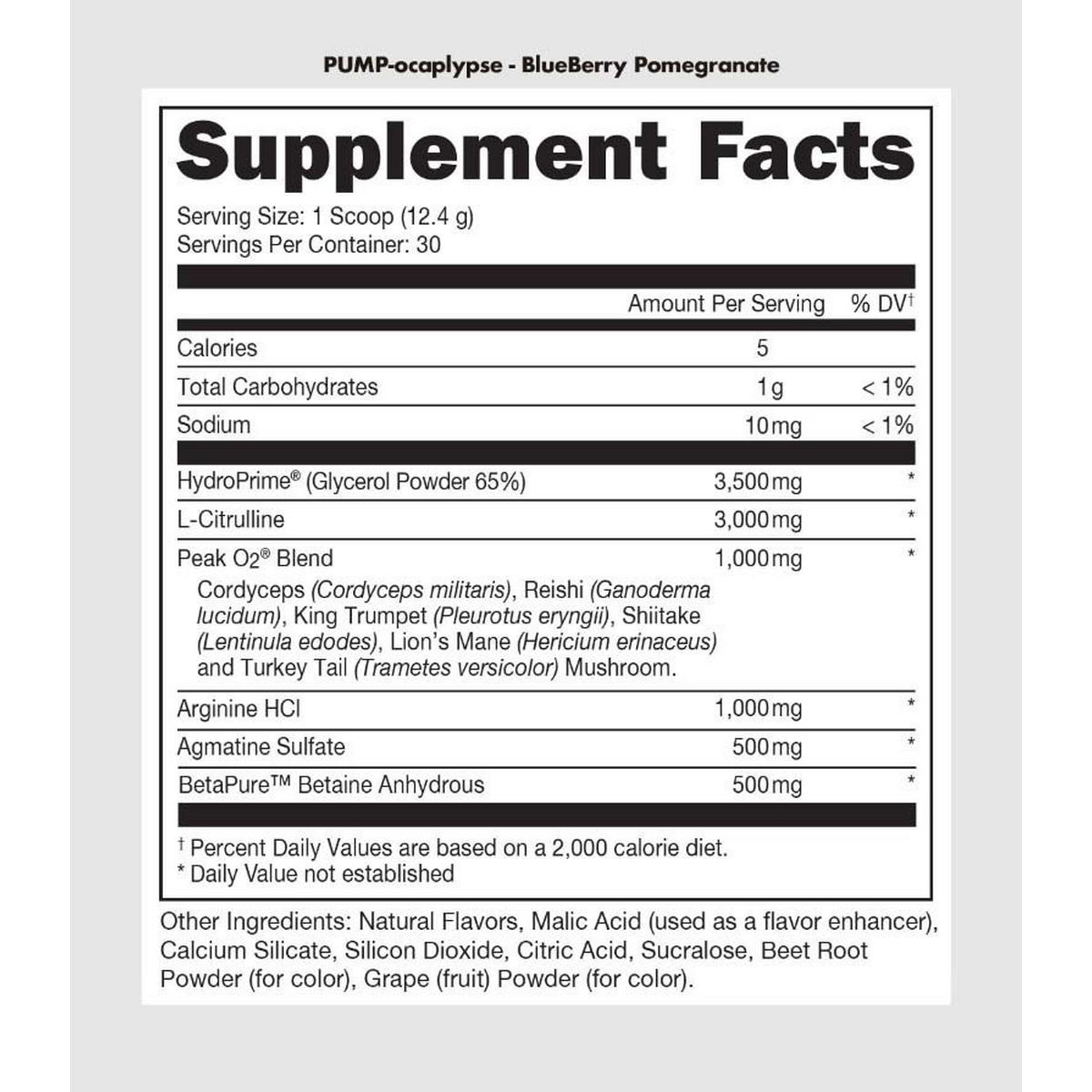 PUMP-OCALYPSE is formulated to enhance every workout. A blend of nitric oxide boosters allows more blood, oxygen, and nutrients to reach the muscles so you get crazy pumps and accelerate muscle growth & recovery.*