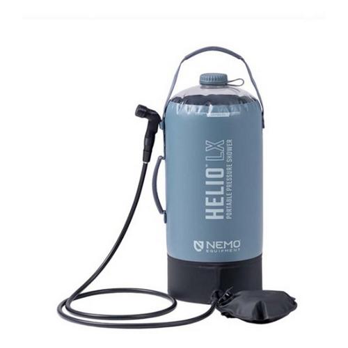 Featuring a modern look and fine-tuned features, Helio™ LX is a truly indispensable part of the camp kit — and everyday adventures! Armed with a pressurizing foot pump, this portable shower provides 7–10 minutes of continuous, steady spraying power without the need to hang or rely on gravity. Keep one in the car to easily rinse muddy hiking shoes, sandy wet suits, sticky hands, and more. Helio LX's 5.8-gallon vertical reservoir is equipped with a large port and easy-grip screw cap for effortless filling and emptying of the tank. (Bonus: The large opening aids with fully drying and cleaning the interior, as well.) Attached to the reservoir is a 7-foot-long neoprene hose with two-stage nozzle that can be manually triggered or set to continuous spray mode for tasks like showering or camp dishes. The extra-long hose is designed to especially complement our 'https://www.nemoequipment.com/collections/all-shower-tents/products/heliopolis-privacy-shelter-and-shower-tent'Heliopolis™ privacy shelter & shower tent, which has a fitted nozzle holder for a hands-free shower experience for luxury in the backcountry. Since the tank cannot be overinflated, it`s easy to top up the pressure during use, and Helio LX`s padded handle allows for comfortable carrying to and from a water source. When it`s time to pack up, the pressure shower folds down small and both the hose and foot pump can be neatly nested under its base until the next use.