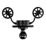 Built into the phone holder is our 1” ball system that allows for easy articulation to achieve a wide variety of positions. The 1” ball mount on the back of the phone holder is also used to adjust the width of the frame and retention wheels. Pulling against the ball releases the spring-loaded gear and allows you to twist clockwise or counter-clockwise to adjust the width to your phone. To find the correct position for your phone, adjust the arms so that your phone is securely held in place. Your phone should roll firmly into place with one-handed operation when the settings are correct.