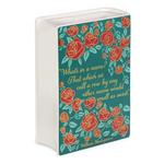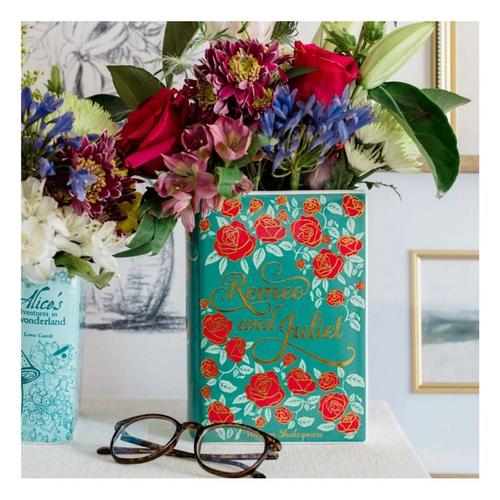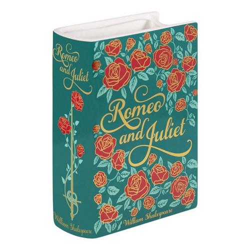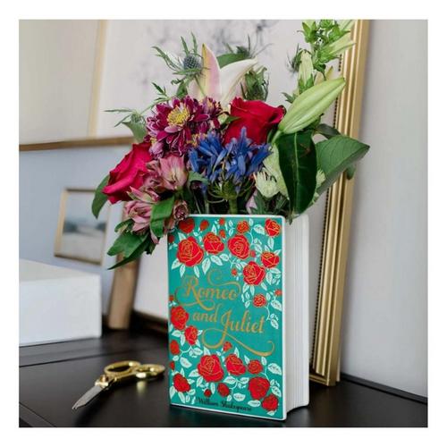 Our large ceramic book vase is the perfect piece for any book lover's space. Designed to mimic a hardcover book, the vase features sculpted pages, with a wide top opening for flowers, desk supplies, utensils, and more. The cover features art inspired by Shakespeare's beloved tale Romeo and Juliet to adorn your space with romantic and bookish charm.