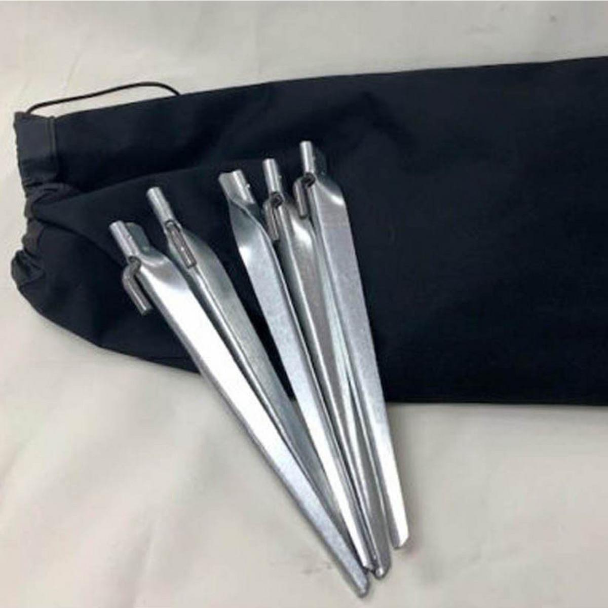 Tent features 12” steel stakes to secure your tent to the ground. Each wall tent comes complete with 200’ of ¼” black polyester rope, rope slips (tension adjusters), and a tent storage bag.