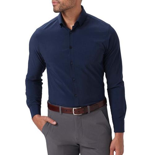 Make business casual look professional with a Men's Mizzen+Main Leeward Long Sleeve Dress Shirt. This Mizzen+Main long-sleeve shirt offers premium performance fabric stretchy material to maintain a pressed wrinkle-free look all day long. The button-down collar keeps your neckline clean and sharp without having to worry about folds or creases. A curved hem bottom allows for an untucked more casual look to this Mizzen+Main long-sleeve as well. Look professional for any occasion with the Men's Mizzen+Main Leeward Long Sleeve Dress Shirt.