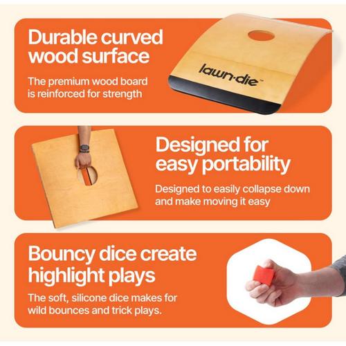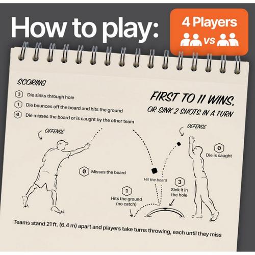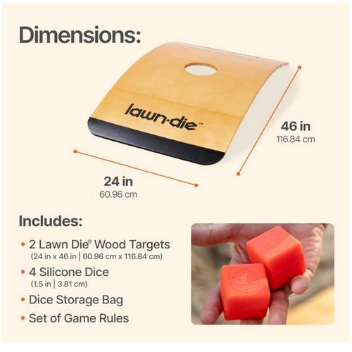 {"reviews":[],"offset":0,"limit":10,"total":0,"gtin":"840281714728"}"Full Description:\nEnjoy hours of outdoor fun with the Lawn Die Toss Game. Easy to set up, portable, and perfect for all ages, it’s a great way to challenge friends and family in the backyard or at the park.\n\nFeatures:\n\u003cul>\n\u003cli>Two 24 in x 46 in wood boards with 6" scoring hole\u003c/li>\n\u003cli>Four 1.5in silicone dice\u003c/li>\n\u003c/ul>\n\nSpecifications:\n\u003cul>\n\u003cli>4 Players\u003c/li>\n\u003c/ul>\n"