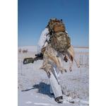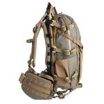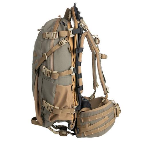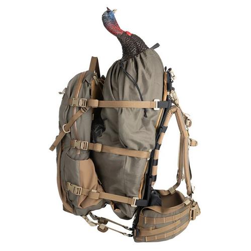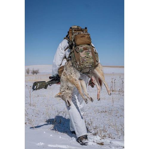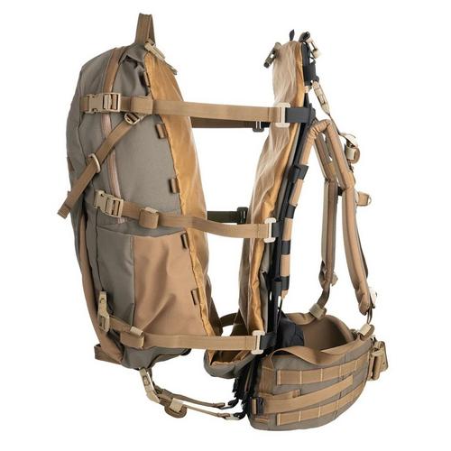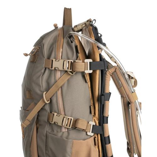 The Hellbender adds an extra 350 in³ to internal storage and a large Bane style pocket on the outside for extra layers or wet gear. The sling is now made from Xpac to help with cleaning up after a successful hunt. The compression straps can move from the main bag to the back seam to keep your optics protected for the pack out. The front panel of the bag has a zippered pocket with key hook inside and a belt pouch matrix above the Bane style stash pocket. Each side has a water bottle pocket that works well with the front pocket compression strap for tripods. Inside the main bag is a Chamber pocket and sleeve for your water bladder. On either side of the top grab handle is a port for the hose. Webbing tracks along the bottom will work with our Sherman and Grab-it pockets. Each bag will come with all the straps necessary to help secure the load.