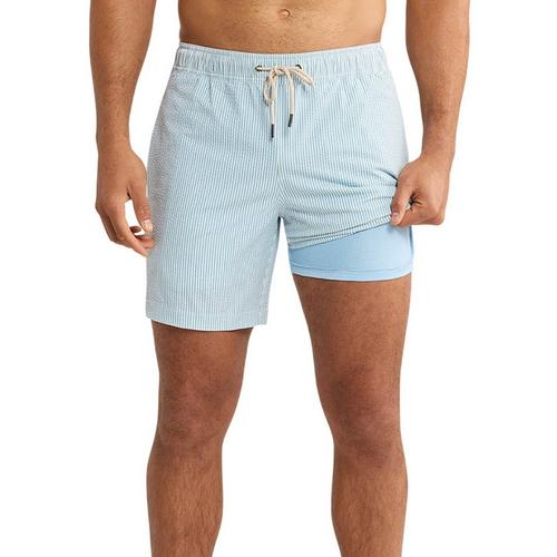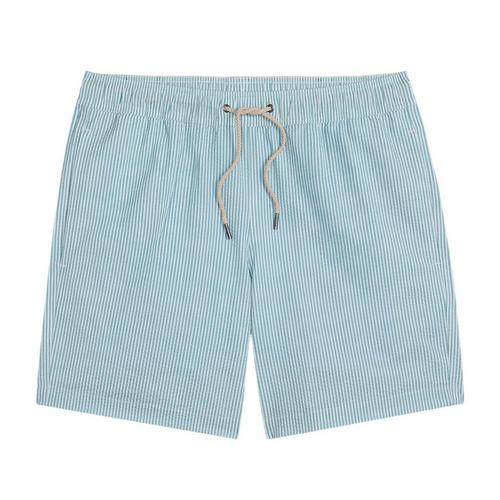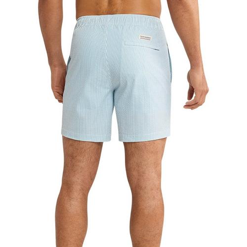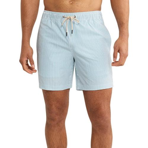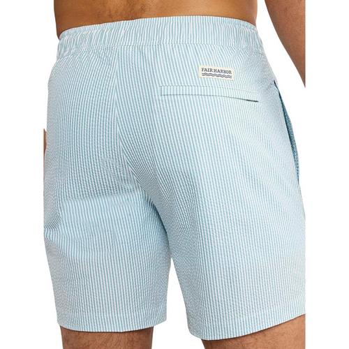 Men's Fair Harbor The Bayberry Swim Trunks offer a heritage look with modern comfort. Featuring a 7-inch inseam, sun-faded fabric, and a tapered leg, these trunks combine tradition with functionality. The classic fit, drawstring elastic waistband, ultra-soft BreezeKnit™ liner, stretch fabric, and water-draining pockets make them a modern essential.