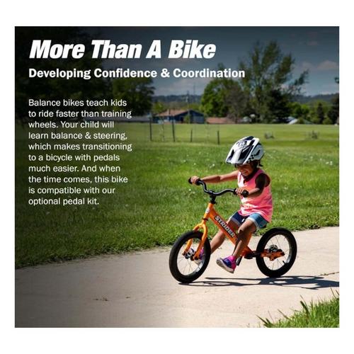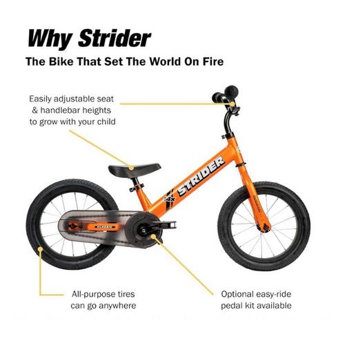 The Strider 14x Convertible Classic Bike makes transitioning to pedals as smooth as possible. Watch as your kiddo takes on a whole new level of striding and crushes the next step of their riding journey! The Strider 14x Classic is the next step for riders in our Strider Learn-To-Ride process, or the best first step for those who may have missed the boat on learning to balance on one of our 12” bikes. The performance seat and handlebars can be effortlessly adjusted to the perfect fit, letting youngsters get a feel for the weight and stability of the bike. Then, simply attach the Easy-Ride Pedal Kit (sold separately) and your little ripper can alternate between striding and breaking in the pedals - no need for prehistoric training wheels! In all, this convertible bike provides kids with a natural progression and encourages them to hit their stride and reach one of the most important milestones out there.