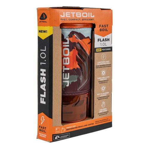 Blistering boil times come standard on the Flash personal cooking system, the ultimate camping stove for preparing coffee, soup, or dehydrated meals on the trail. Optimized for efficiency, the Flash boils water lightning-quick, making it the fastest Jetboil ever. Jetboil's 1-liter FluxRing cooking cup with insulating cozy makes boiling water—and keeping it warm—a breeze. Start heating instantly with the convenient, reliable push-button igniter, and verify that the water's ready with the thermochromatic color-change heat indicator. Compatible Jetboil accessories, such as a coffee press, hanging kit, pot support, skillet, FluxRing cooking pot, and utensils make this a necessity for your next backpacking adventure. Includes fuel canister stabilizer; bottom cup doubles as a measuring cup and a bowl; easy to pack and carry at only 13.1 ounces.