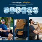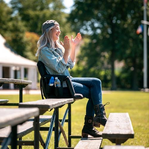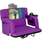 Premium wide reclining stadium seat with folding armrests and thick cushioned support, featuring 6 reclining positions, waterproof polyester construction with reinforced PVC base, dual cup holders, large storage pockets, bleacher hooks, and safety strap for stable, comfortable seating on bleachers and outdoor surfaces.