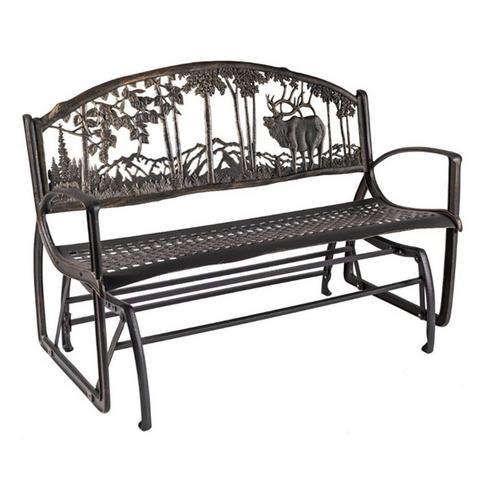 A single bull elk amidst a mountain scene creates a stunning back to our Cast Iron Elk Glider Bench. The glider includes a maintenance-free bronze powder coat finish with hand-painted gold highlights. Like all our gliders, it is smooth, quiet and comfortable. Designed by a wildlife artist.