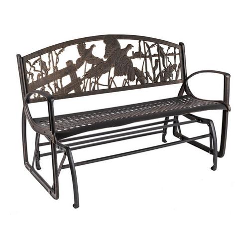 Bring your favorite pheasant scene into your own backyard wth this artist-designed Cast Iron Pheasant Glider Bench. The glider features two pheasants flushing out of brush in front of a farm and includes two layers of premium powder coat and hand-painted gold highlights.