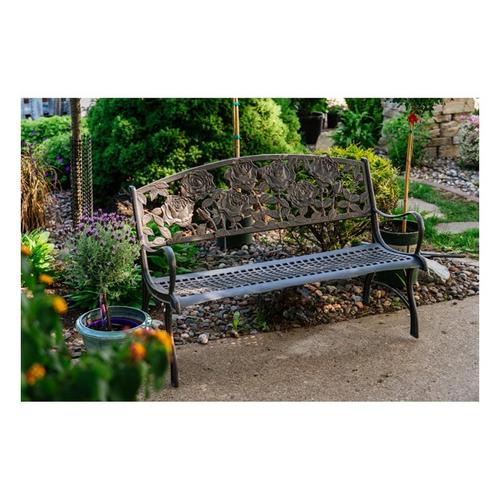 You don't need a green thumb to revel in the perfectly bloomed roses on our Cast Iron Rose Bench. The bench is artist-designed using premium materials, ensuring it is both a beautiful and maintenance-free addition to your garden, deck or outdoor patio. Includes a bronze power coat bronze finish and hand painted gold highlights.