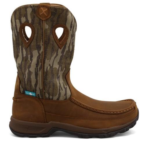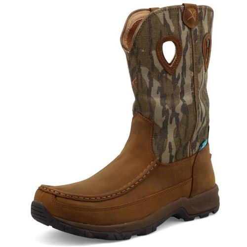 The Men's Waterproof 11" Pull-On Hiker Boot is handcrafted with premium full-grain leathers and features a breathable waterproof lining and air-mesh lined shaft. The Twisted X molded footbed and three-quarter length composite insole provide all day cushion and support. The full-length molded EVA midsole provides a layer of shock absorption for the entire foot. This is paired up with a durable molded rubber outsole for traction in challenging conditions. To improve the footwear lifespan this outsole has an integrated toe cap and heel kick. These features blend to produce a versatile boot that has increased functionality compared to other casual footwear.