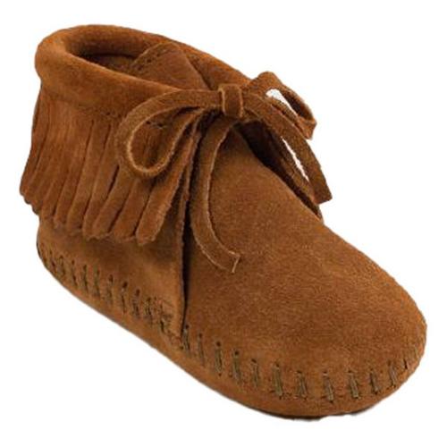 Its supple leather will form to their foot with every step while its padded footbed will keep them completely cozy in the meantime. A simple tie closure promises easy on and off. A layer of fringe and hand-stitched details make these infant moccasins beloved by children all over the world.