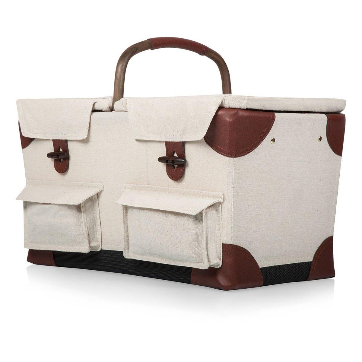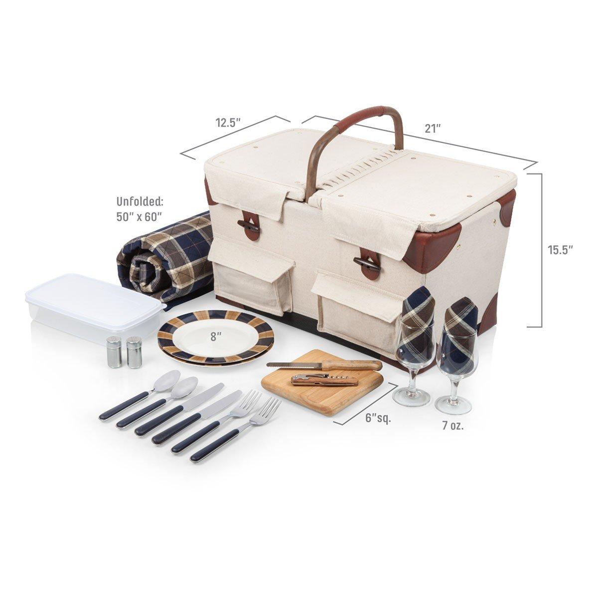 Show up to the park or beach like the sizzling trailblazer you are. The Pioneer Deluxe Picnic Basket with Picnic Blanket is a luxurious canvas picnic basket set with vintage chic styling and romantic wine and cheese accessories. This picnic basket for 2 is designed for adventure with its lightweight canvas-covered wooden body, double lid, and swanky service for two. Porcelain plates, hand-blown wine glasses, stainless steel silverware and waiter-style corkscrew, wooden-handled cheese knife, hardwood cutting board, and food storage container all strap securely into this spacious picnic basket set. Even with the matching navy/khaki 100% cotton napkins and picnic blanket there’s still plenty of room for wine, cheese, charcuterie and all your picnic favorites. See ya down on the trail.