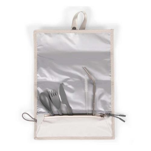 The Tarana Lunch Bag Cooler with Utensils is the perfect personal cooler set, with a shell made from 16 recycled water bottles, a water-resistant placemat, recycled plant fiber utensils, and reusable metal straw.
