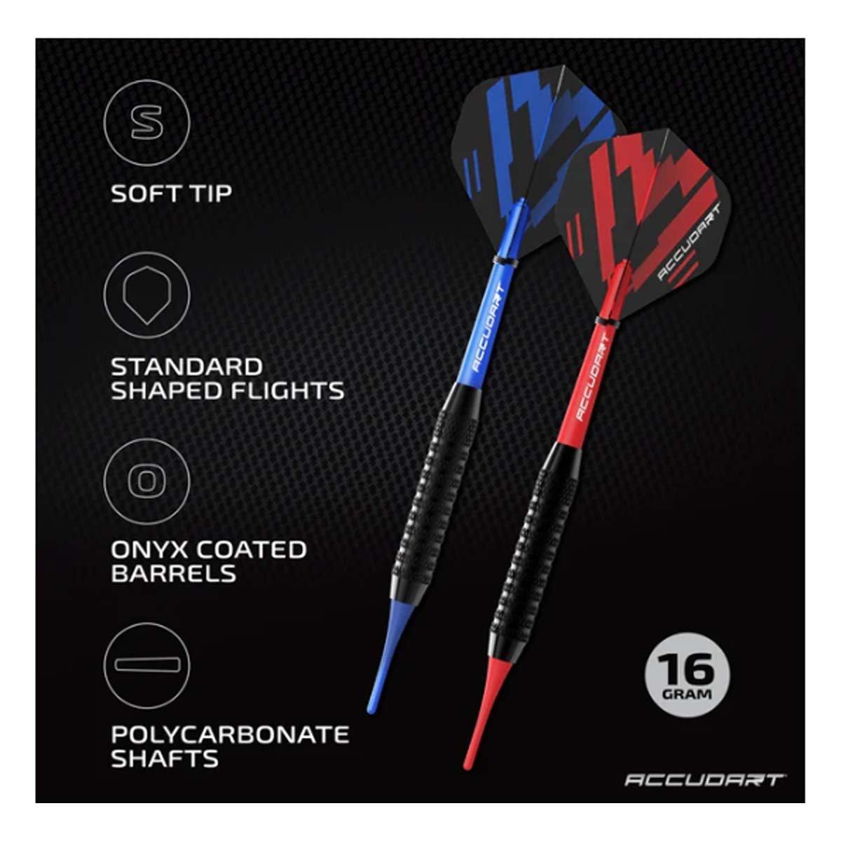 Elevate your dart game with the Accudart 24 Dart Multi-Pack, perfect for team play in the game room or at the pub. Featuring sleek onyx coated soft tip barrels weighing 16 grams each, this dart set ensures precision and durability, ideal for competitive play on electronic dartboards. The included polycarbonate shafts boast durability with spring clips that securely tighten down flights, guaranteeing optimal performance. Paired with standard poly flights, this set provides balanced flight, drag, and speed, allowing players to achieve their best throws. Accudart, the original pioneer of tungsten darts in the US, brings over 50 years of expertise to the table, emerging from esteemed industries like automotive and aerospace. Their commitment to innovation and superior craftsmanship empowers darting enthusiasts of all levels to unleash their full potential on the board.