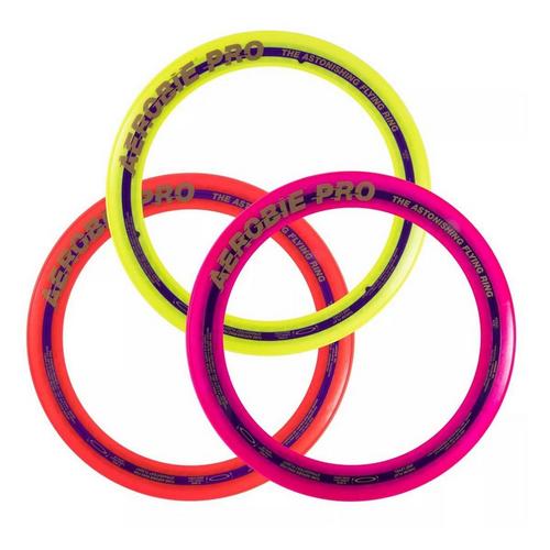The Aerobie Sprint Ring features a compact, thin design that creates longer distance flights, traveling twice as far as most conventional flying discs! This flying ring is great for playing in the backyard, park, or school playgrounds. Stash it in your backpack for pick-up catch games with friends anytime. The open center allows each player to personalize their throwing and catching style – catch the edge with your hand or use the center to catch it with your arm or foot. Create your signature moves with Aerobie flying discs! The Aerobie Sprint Ring measures 10 inches in diameter. Available in assorted neon colors. Sold individually. Note: This disc does not float in water. Ages 7+.