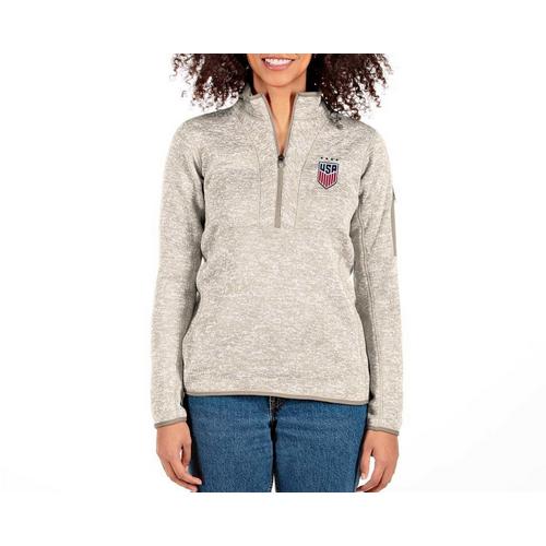 For an extra layer when the temperatures drop, wear the Antigua Women's USWNT Fortune 1/4 Zip. With USA colors and graphics, you’ll be able to show off your team pride throughout the entire season and year. Made with soft fabric, you’ll stay comfortable throughout the whole game in the Antigua Women's USWNT Fortune 1/4 Zip.