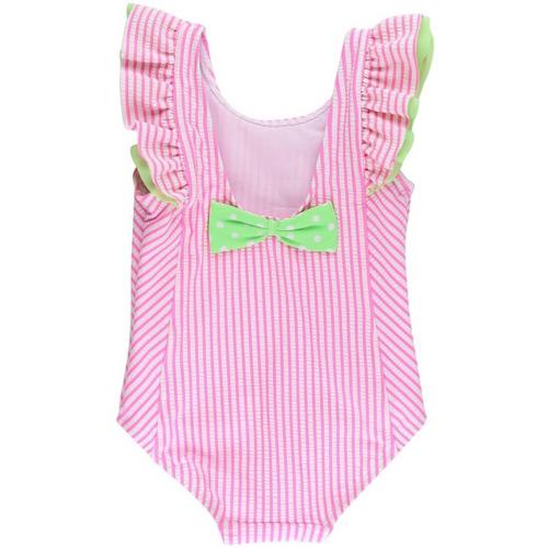 Neon Pink Seersucker Seersucker Waterfall One Piece Swimsuit: Dive into style with this vibrant neon pink swimsuit designed especially for girls. The ruffle detail cascades like a waterfall, adding a playful touch to this pink seersucker one-piece. It features a bow detail that enhances its charming look, perfect for any fun water activity. This swimsuit is not only stylish but also practical with full seat coverage ensuring comfort and modesty. Crafted with a 4-way stretch fabric, it offers great flexibility and fits snugly, allowing freedom of movement in and out of the water. Moreover, the fabric is designed to resist snagging and pilling, making it durable for endless summer adventures. It's also a fully lined girls swimsuit, providing extra protection and privacy. Importantly, this neon pink girls swimwear comes with UPF 50+ sun protection, safeguarding your little one from harmful UV rays. Ideal for those sunny days at the beach or pool, it combines style, comfort, and protection perfectly.