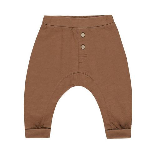 Super-soft slub knit pants with coconut button detail at center front. Featuring rolled leg cuffs, an elastic waistband, and a dropped crotch.