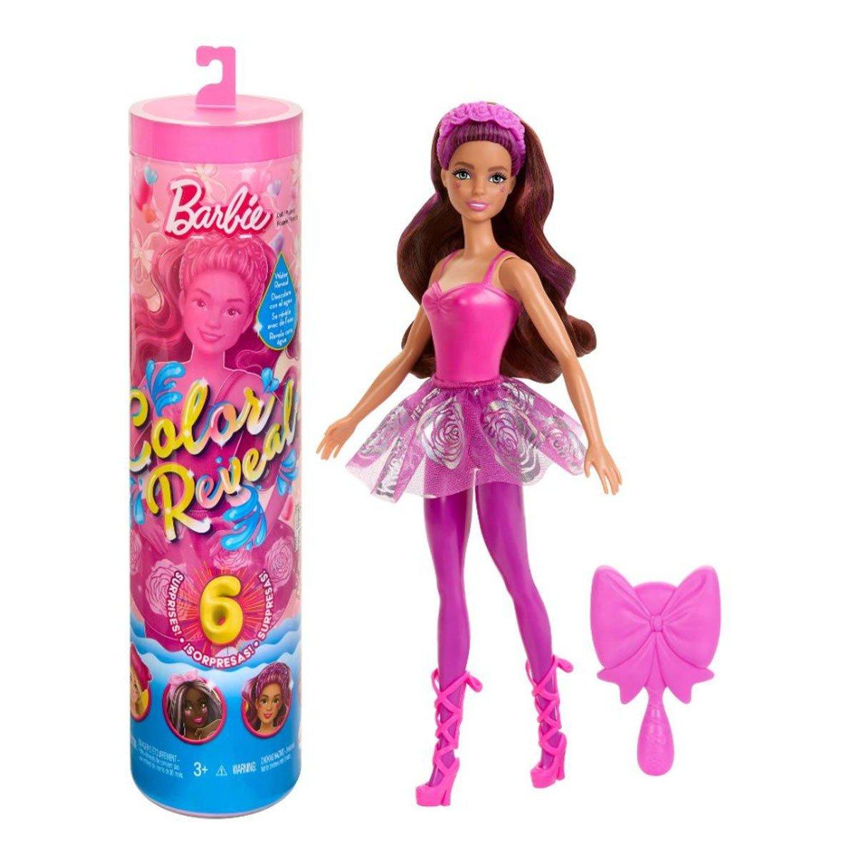 Barbie Color Reveal dolls deliver an unboxing experience full of surprises, six of them! With this series inspired by balletcore fashion, kids find one of four unique dolls -- each features long hair with a brightly colored streak. Which doll will you reveal? Fashions and accessories include a ballet-inspired skirt, unique head piece, lace-up platform ballerina shoes and a bow brush. Also includes a makeup color-change feature on the doll's face. Use the packaging tube to store these and other pieces. Kids can collect them all for mix and match fun. Each sold separately, subject to availability. Dolls cannot stand alone. Colors and decorations may vary.
