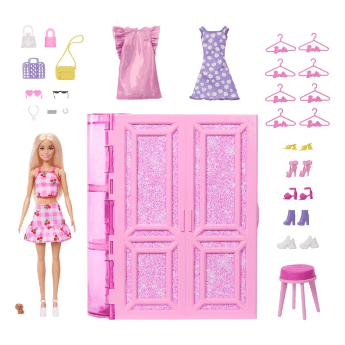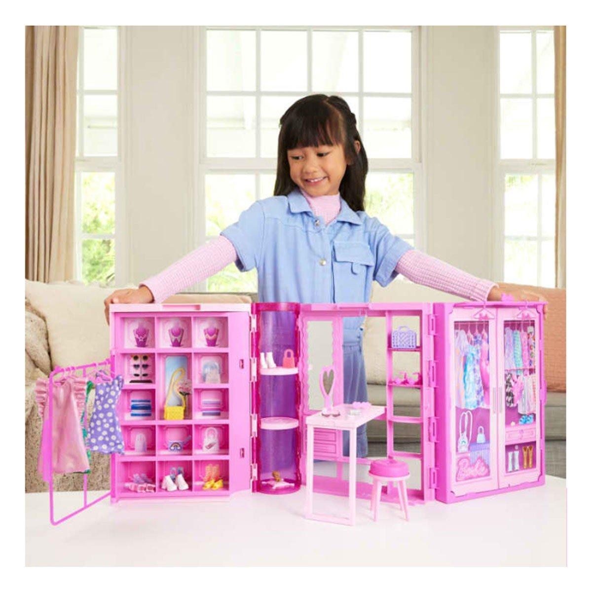 This Barbie Dream Closet is packed with endless styles and stories kids can create for Barbie! Open the glittery pink wardrobe to reveal a 3-foot-wide playset with 2 clothing racks, 20+ storage spaces, a fold-down vanity with a pop-up mirror, full-length mirror, and shoe shelf. There's even a pillow for the pet puppy! Kids will love styling the included Barbie fashion doll with 25+ clothes and accessories like dresses, shoes, necklaces, and purses galore. Mix and match 3 complete looks for Barbie to dive into styling and storytelling play! Kids can help Barbie doll choose an outfit on the rack, style and accessorize at the mirror, then finish getting ready at the vanity before she heads out in style with her pet pup for the best day ever! For easy storage, all the pieces fit inside the closet with a pink Barbie handle for on-the-go fun. Doll cannot stand alone. Colors and decorations may vary.