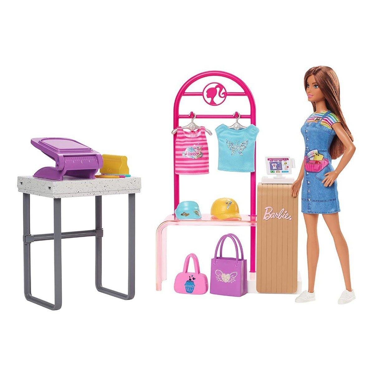 Kids can sew up a career in fashion with Barbie doll and the Make & Sell Boutique playset! Young designers will love creating their own looks with the easy-to-use foil screen-printing feature. A display rack and hangers showcase the original designs for purchase, and customers can shop with a realistic register and card reader! Five foil sheets and reusable stickers allow repeat fun and endless possibilities. Doll cannot stand alone. Colors and decorations may vary.