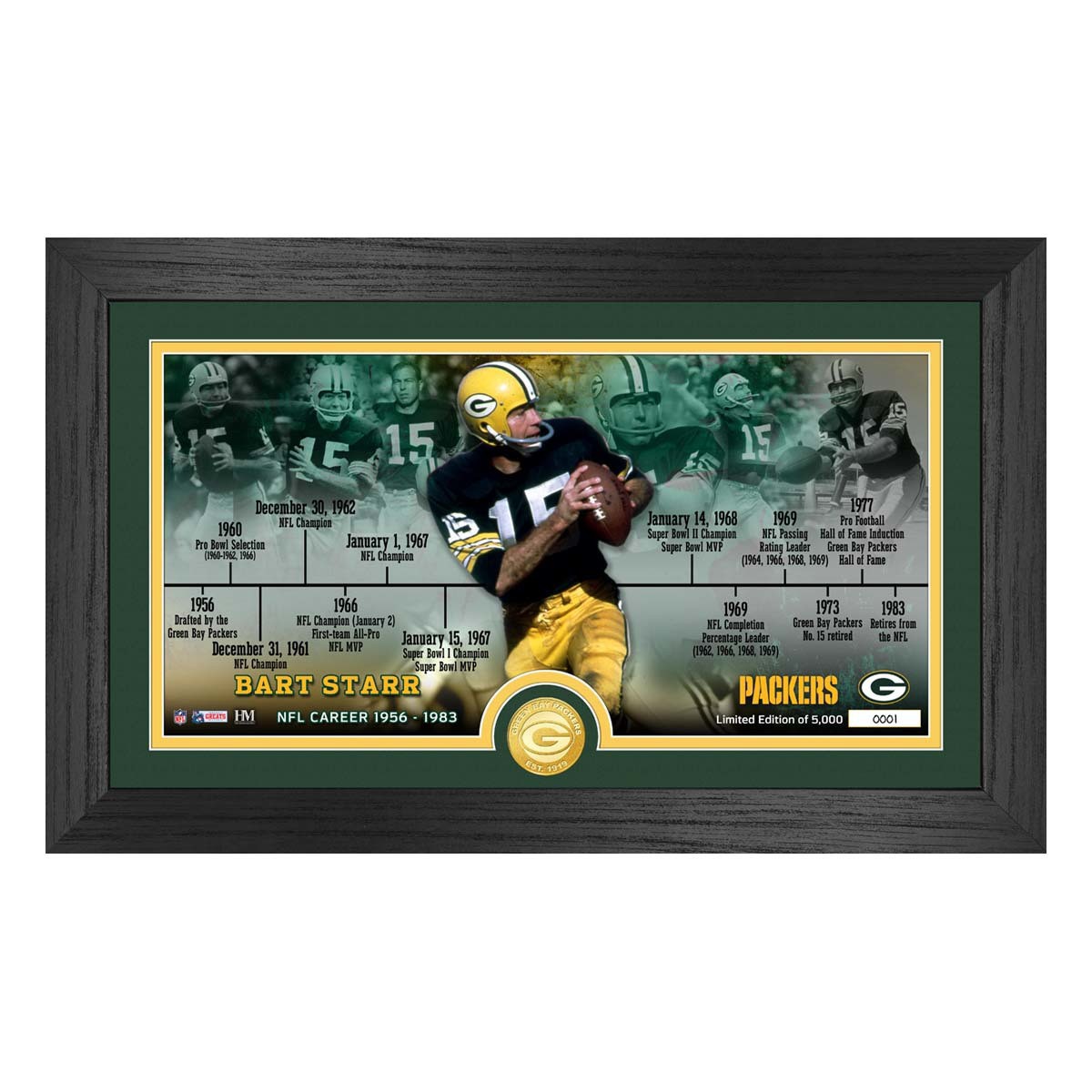 Proudly display your Green Bay Packers spirit with the Bart Starr Packers Career Timeline Bronze Coin Pano Photo Mint. Whether you’re a collector of all things Green Bay Packers or want to display your pride, this piece of Green Bay Packers memorabilia will help you do just that. From the home to the office, this NFL collectible will help you show off your team pride. With the Bart Starr Packers Career Timeline Bronze Coin Pano Photo Mint, no one will doubt your favorite NFL team.