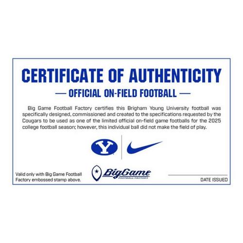 The 2025 BYU Cougars bring a legacy of discipline, and competitive fire, and this is the same Nike Vapor Elite game ball they’ll trust in Provo. Featuring BYU’s iconic branding, and navy-and-white detailing, this football is handcrafted by Big Game Football Factory in Dallas, Texas.