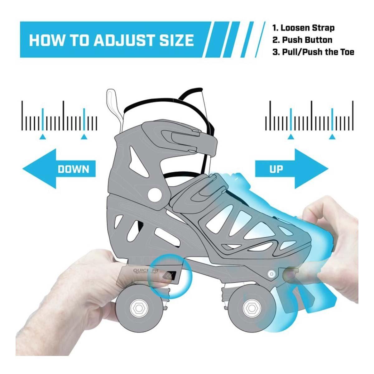 Perfect for growing kids who love to skate, the Trac Star offers performance and comfort with adjustable sizing to accommodate growing feet. High quality components and lightweight technology make it easy and fun to roller skate indoors or outdoors. Hinged shell and padded, washable liner give support and comfort for any skill level. Easy fit buckles and no laces to tie make it easy for children to put on themselves. The chassis is lightweight and durable with real trucks for controlled turning. In fact, these quad skates for kids are built for maximum agility and support. You'll be amazed at how quickly your child will be zooming along sidewalks or around the skating rink. 54mm Urethane wheels have just the right grip and bounce for both indoors and outdoors and are loaded with G-Force 608ZB carbon bearings. These adjustable roller skates for kids fit true to a child's shoe size.