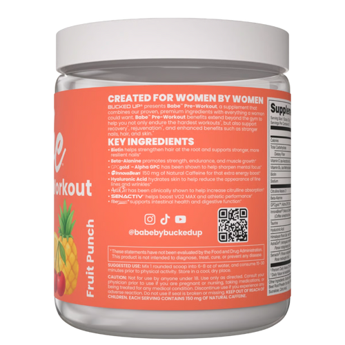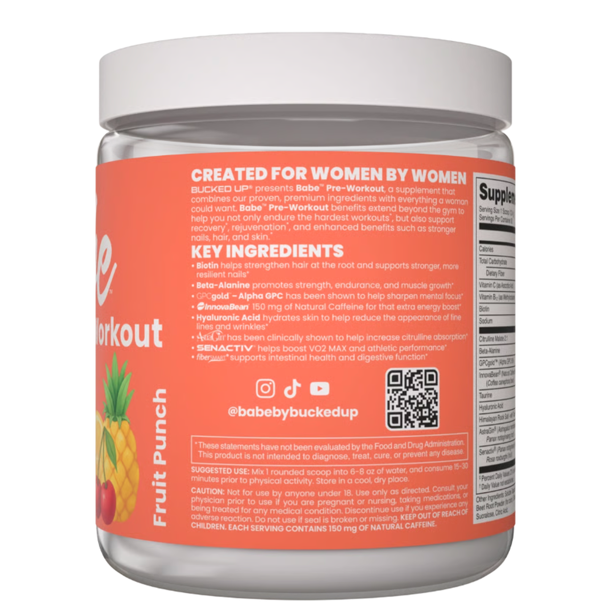 Bucked Up presents Babe Pre-workout, a supplement that combines our proven, premium ingredients with everything a woman could want. Babe is designed by women, for women, ensuring that you get the best workout experience from the best pre-workout for women.
