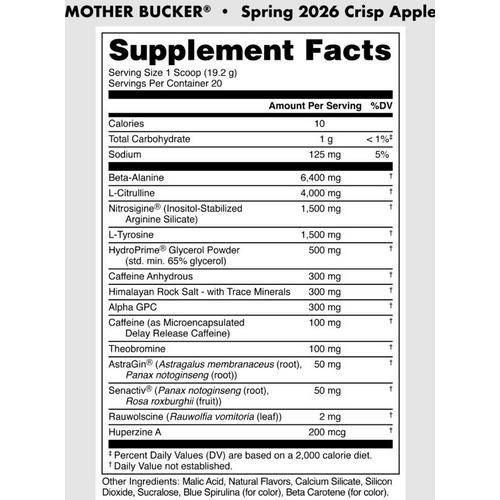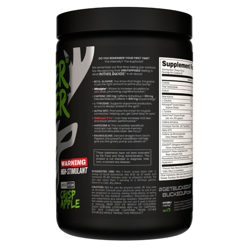Mother Bucker is not for the casual gym-goer or those new to pre-workouts. This new pre-workout is only for those who possess an intense drive. It's a powerful formula! The truth is, this pre-workout is designed for experienced users. If you?re ready for serious power, then become a MOTHERBUCKER and turn it up to 11.