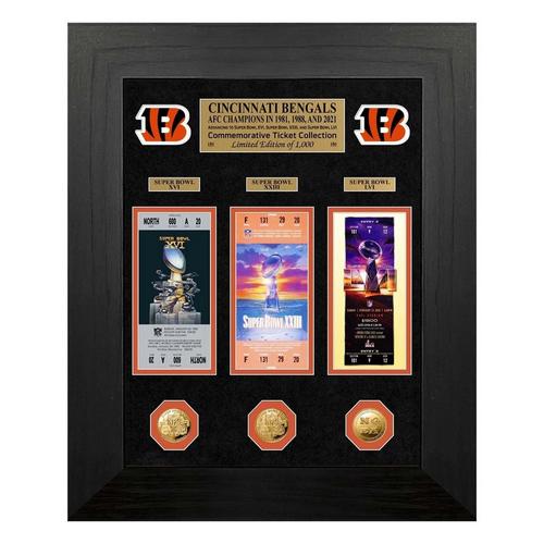 Proudly display your Cincinnati Bengals spirit with the Cincinnati Bengals Super Bowl Deluxe Gold Coin & Ticket Collection. Whether you’re a collector of all things Cincinnati Bengals or want to display your pride, this piece of Cincinnati Bengals memorabilia will help you do just that. From the home to the office, this NFL collectible will help you show off your team pride. With the Cincinnati Bengals Super Bowl Deluxe Gold Coin & Ticket Collection, no one will doubt your favorite NFL team.