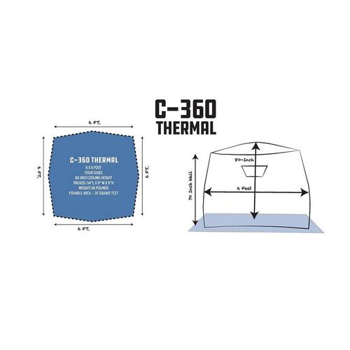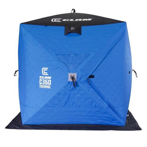 The C-360 Hub Shelter by Clam packs down small for the anglers on the move. And a thermal skin keeps heat in and reduces propane use. Combine this with advanced hub technology and you have a superior pop-up portable ice shelter— the C-360 Thermal Hub. It also has the head and fishing room comparable to our competitors models. The C-360 Thermal Hub the perfect ice fishing shelter for anglers and their families looking to stay warm and comfortable this winter!