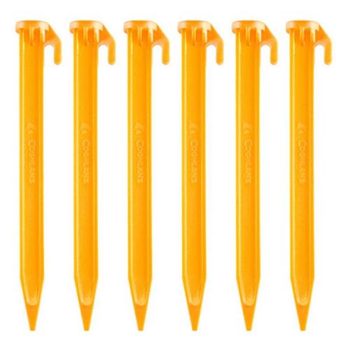 Coghlan'sTent Pegs offer durability and strength you can rely on to keep your tent where it belongs. Made of 100% post-consumer recycled plastic, these tent pegs are lightweight and light on the environment. Their wide-flanged design firmly anchors in various ground types including loose soil. The durable head can withstand mallet strikes and offers multiple options for securing your guylines.