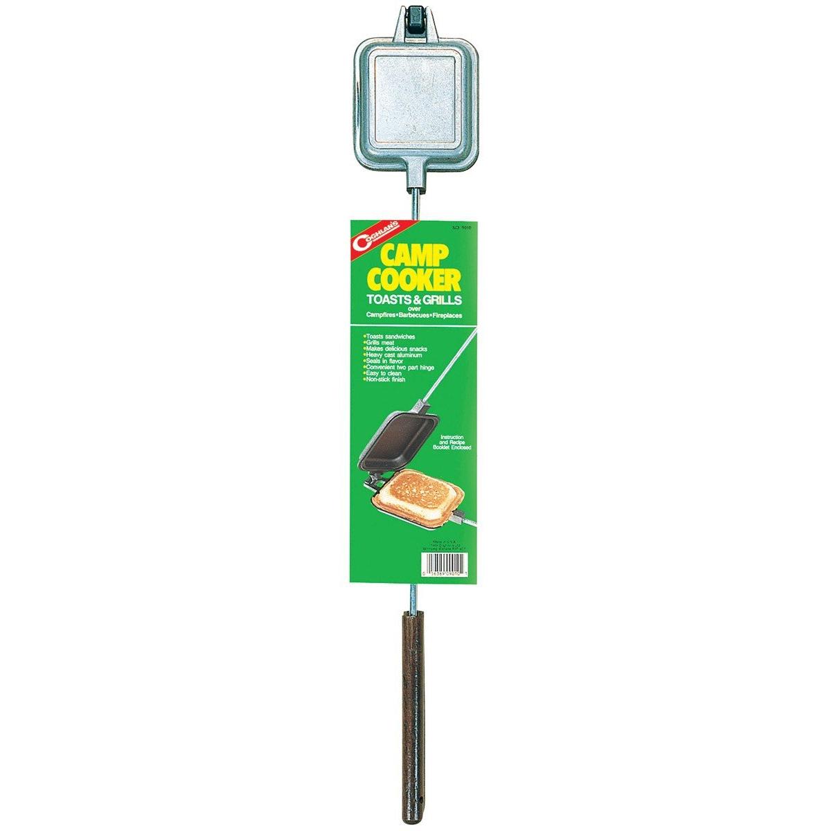 Toasts sandwiches grills meat and makes awesome pie-filling desserts all over an open fire. The camp cooker is made from lightweight cast aluminum with a two part hinge. Easy to clean with the non-stick finish. Measures 26".