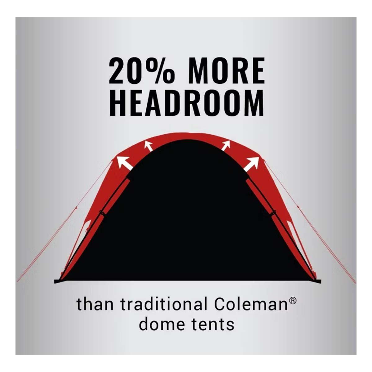With a quick setup under 5 minutes, the Coleman® Dark Room™ Skydome™ Camping Tent lets you enjoy more time with friends and family on your next camping trip. There is plenty of room to stretch inside the spacious interior thanks to the nearly vertical walls that offer 20% more headroom than a traditional Coleman dome tent, and a wide door design means you can move air beds, sleeping bags, and other gear in and out with ease. Plus, Dark Room technology blocks 90% of sunlight and reduces heat inside the tent (vs. a comparable Coleman tent) so you can rest at any time in comfort. Downpour in the forecast? Not to worry, the WeatherTec™ system's tub-like floor, patented welded corners, and inverted seams help keep you and your gear dry. Skydome tents are available in a range of sizes (2-person, 4-person, 6-person, or 8-person), with or without Dark Room technology.