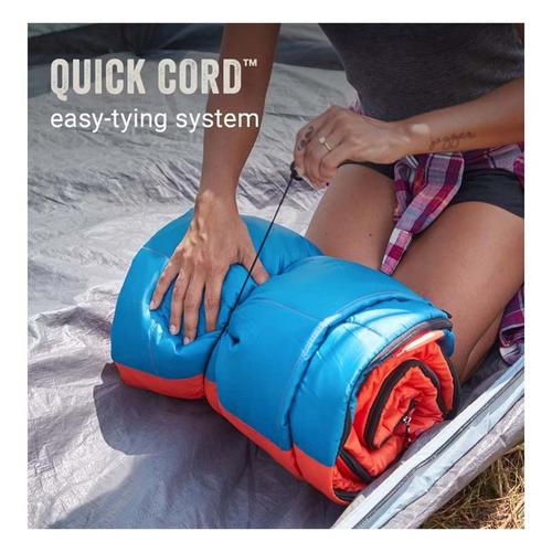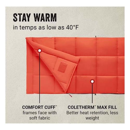 Get a sleeping bag that packs up small and keeps you warm with the Coleman® Kompact™ 40°F Rectangular Sleeping Bag. Thanks to Coletherm™ Max premium and lightweight fill, you’ll get better heat retention with less weight. The compressible stuff sack with cinchable side straps tightens the sleeping bag into a compact size making it easier to carry and store. You’ll stay warm throughout the night thanks to the Thermolock™ draft tube that prevents heat from escaping through the zipper—and with the ZipPlow™ zipper you get snag-free opening and closing every time. The Comfort Cuff™ design provides soft protection and comfort around your face as you fall asleep. When it’s time to pack up, the Roll Control™ design keeps your sleeping bag straight while you’re rolling it and thanks to the Quick Cord™ tying system the bag stays securely rolled. After your last camping adventure of the season, place the sleeping bag in the washing machine so it’s good to go for next time. The Coleman® Kompact™ Rectangular Sleeping Bag is available 20°F, 30°F, and 40°F for colder to milder temperatures.