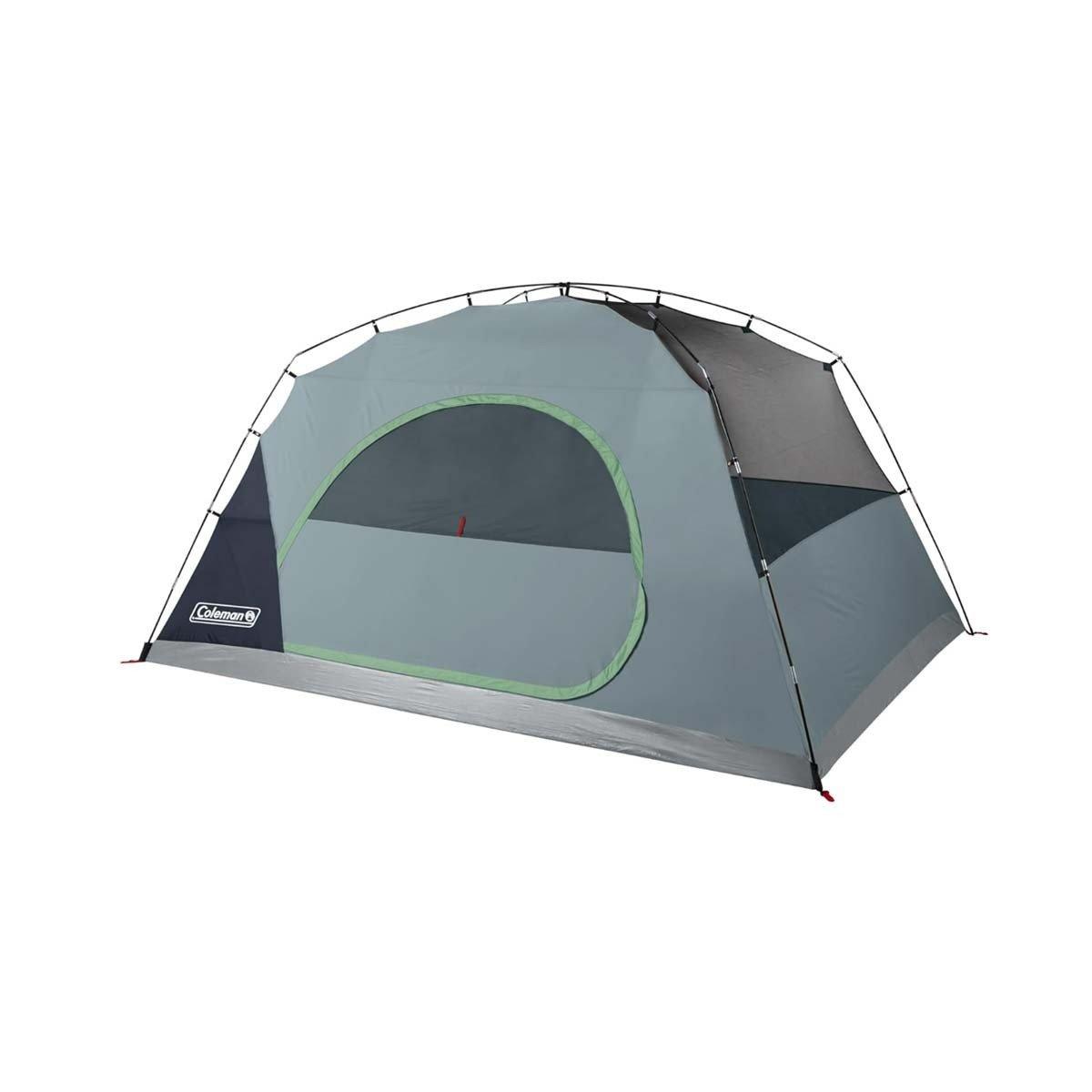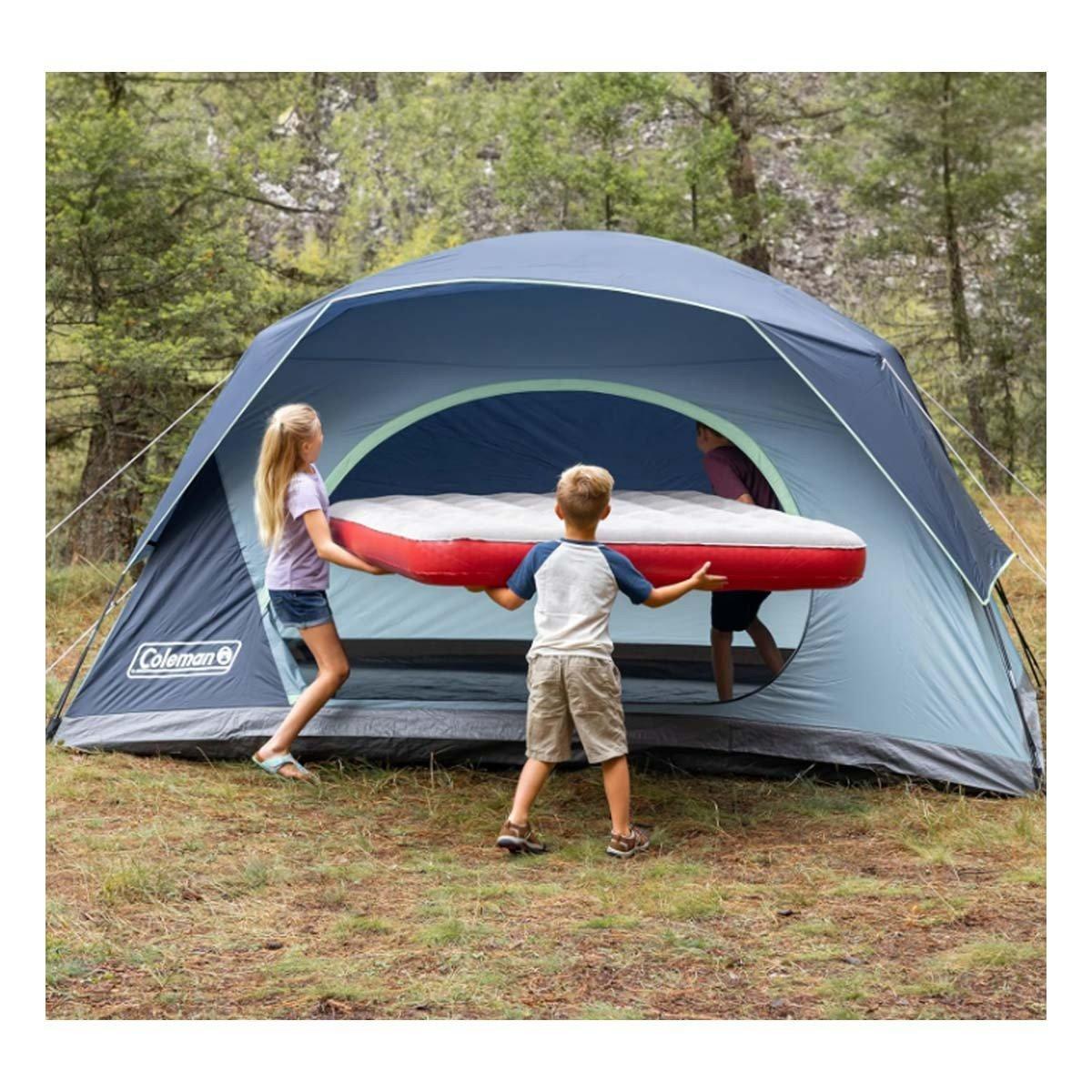 With a quick setup under 5 minutes, the Coleman Skydome Camping Tent lets you enjoy more time with friends and family on your next camping trip. There is plenty of room to stretch inside the spacious interior thanks to the nearly vertical walls that offer 20% more headroom than a traditional Coleman dome tent. Plus, a wide door design means you can move air beds, sleeping bags, and other gear in and out with ease. Downpour in the forecast? Not to worry, the WeatherTec system's welded corners and inverted seams help keep you and your gear dry. This 4-person tent's compact size makes it a great choice for car camping or backpacking adventures. Skydome tents are available in a range of sizes (2-person, 4-person, 6-person, or 8-person), with or without Dark Room technology.