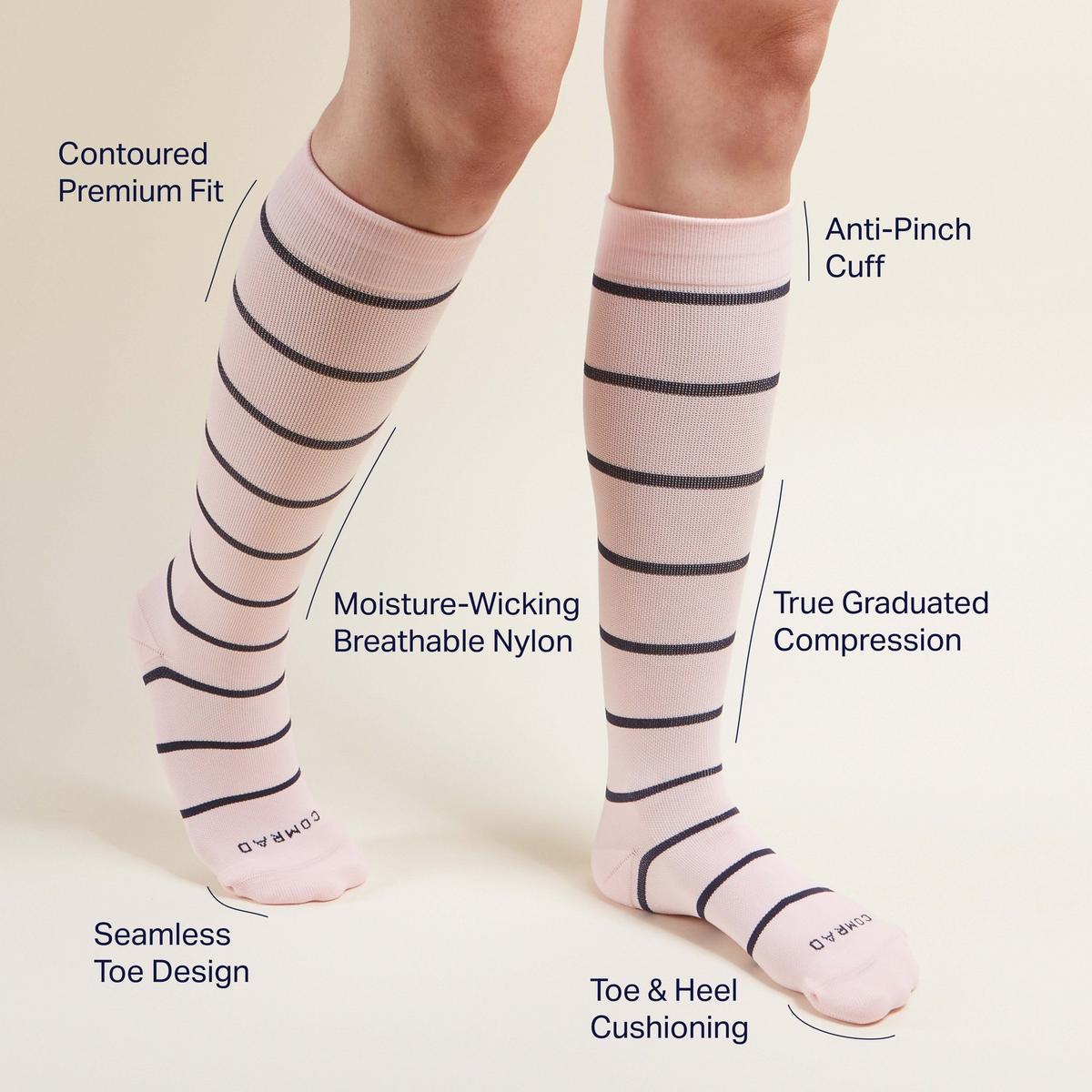 Introducing Comrad The Companions Stripe Compression Socks, the ultimate companion for your feet! These top-notch socks offer superior compression, providing optimal support and comfort all day long. Crafted with premium materials, they are designed to improve circulation, reduce swelling, and alleviate fatigue, making them an excellent choice for athletes, travelers, and anyone on their feet for long periods. With a stylish solid color design, these socks are not only functional but also fashionable. Say goodbye to discomfort and embrace the benefits of Comrad.