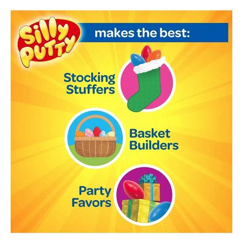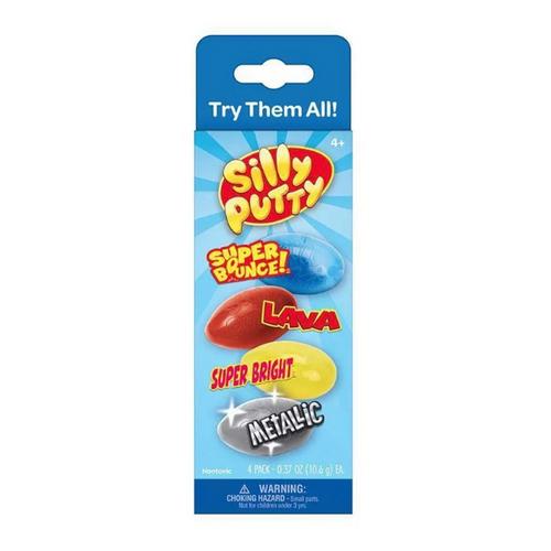 The Crayola Silly Putty Variety Pack (4 Ct) offers four vibrant, bouncy putties for endless fun! Perfect for stretching, squishing, and molding, it's great for sensory play and creative fun without the mess.