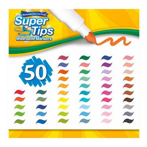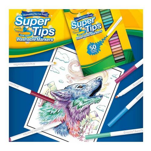 Washable Super Tips Markers feature a versatile tip that draws both thick or thin lines. Crayola's washable ink is specially formulated to easily wash from skin and most children's clothing. Includes 50 Washable Markers. Won't bleed through paper