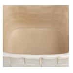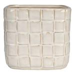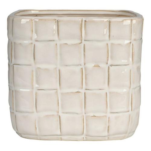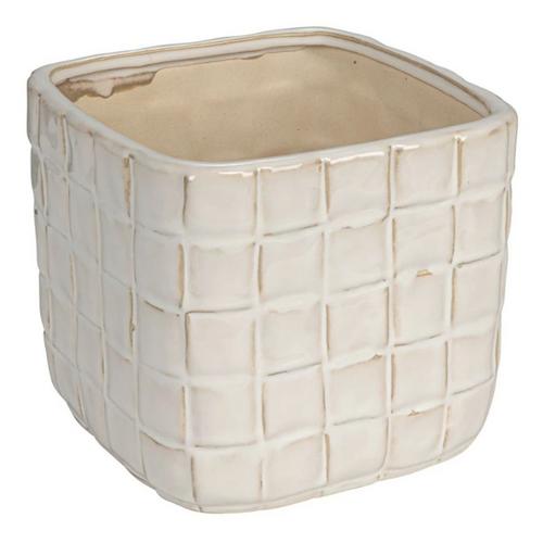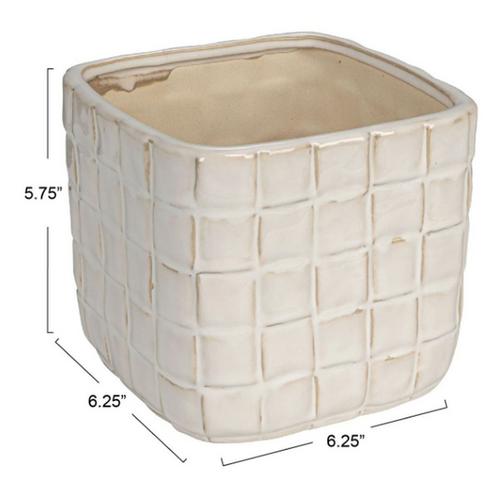 Enhance the space with this Stoneware Planter with Debossed Woven Grid Pattern, White. This planter is made of high-quality stoneware that has a smooth texture and a debossed woven grid pattern that creates a subtle and elegant look. The white color adds a touch of brightness and simplicity to the planter. It has a square shape that can hold a 6-inch pot of the choice. Use it to display plants or flowers indoors or outdoors. It measures 6.25 inches in length, width, and 5.75 inches in height, making it a perfect size for any space. This planter is ideal for adding a farmhouse, coastal, boho, modern, or transitional style to the space. It is not only functional but also decorative. It will make the space look more inviting and cozy.