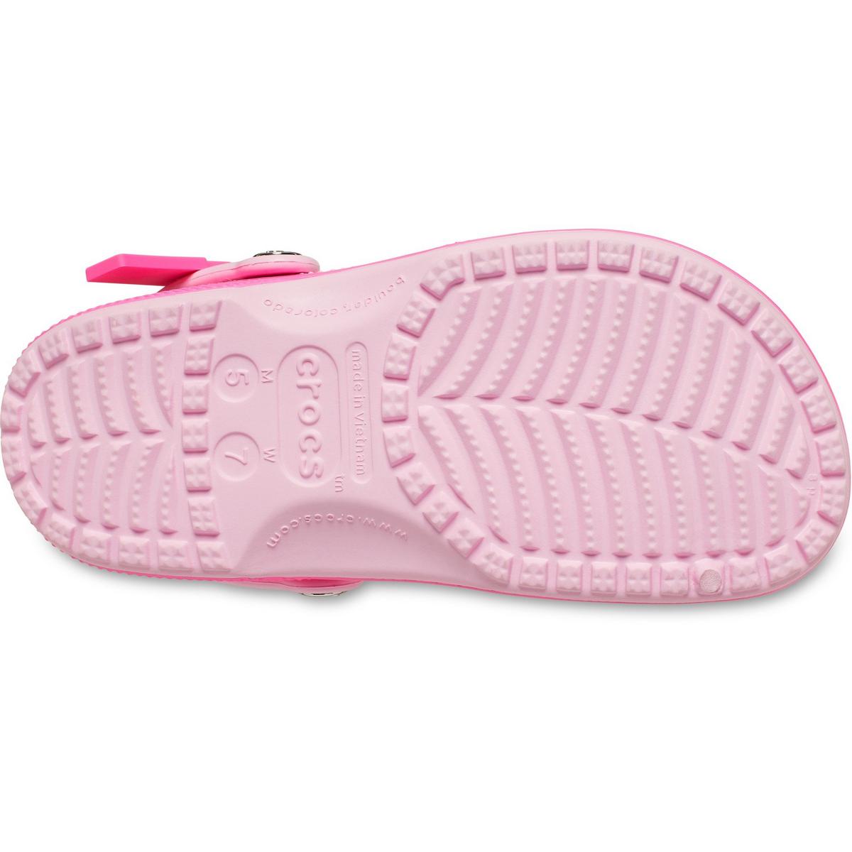 The new Barbie™ Classic Clog is the perfect statement shoe for fashion icons everywhere. This comfortably chic style comes in a pink hue with a stylish all-over monogram print. Make your look shine with elevated enamel Jibbitz™ charms featuring a Dreamhouse™, roller skate, palm tree, heart sunglasses, and Barbie™ logo.