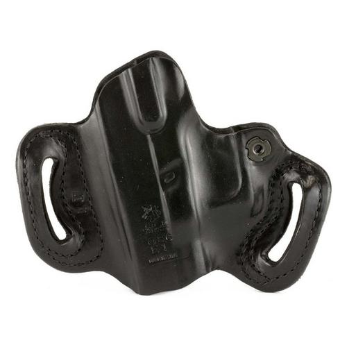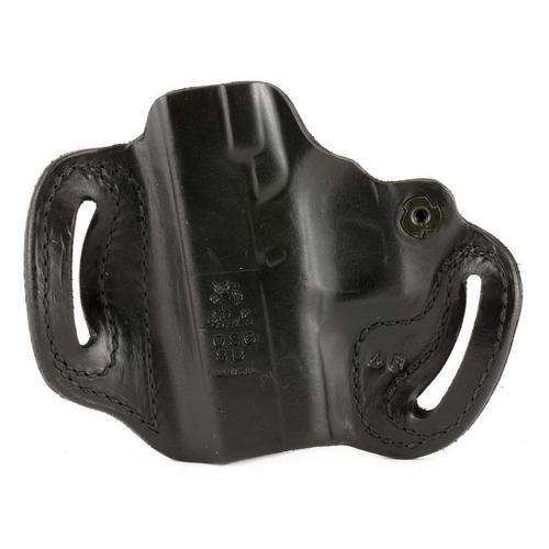 The Mini Slide® is a premium saddle leather, double seams and a highly detailed molded fit, make this exposed muzzle, tight fitting, two-slot holster a great choice for your favorite pistol. It features an adjustable-tension device. Available in black or tan unlined leather. Belt slots are 1 3/4" wide.