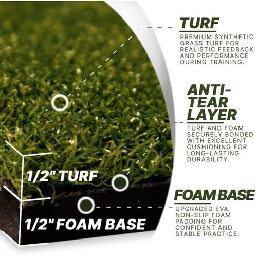 The mat's durable 1/2" foam base and commercial-grade synthetic turf provide a real grass feel, perfect for practicing both iron and driver shots. The non-slip base keeps the mat securely in place, so you can practice with confidence.
